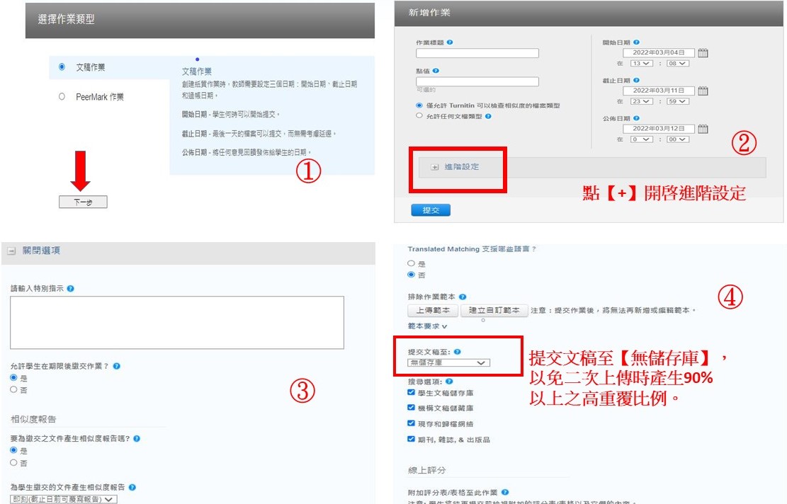 (1)教師於Turnitin平台新增課程後,添加作業時,請務必將【進階設定】開啓,並設定提交文稿至【無儲存庫】。如果利用【快速提交】功能,同樣也要開啓進階設定,並設定提交文稿至【無儲存庫】。