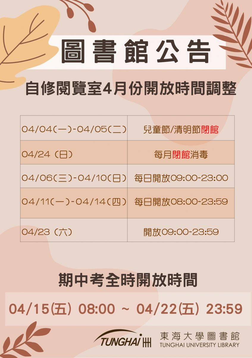 自修閱覽室四月分開閉館時間公告