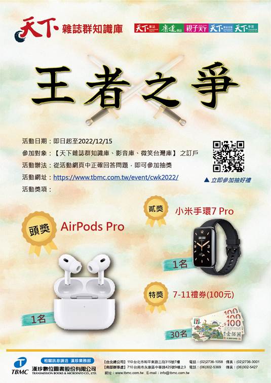 漢珍數位圖書為提升【天下雜誌群知識庫】使用效益,將於即日起~2022/12/15期間進行《天下 王者之爭》活動。只要師生透過本活動網頁正確回答問題,即可將”AirPods pro、小米手環 7 pro、7-11禮券”等好禮帶回家~邀請師生上線體驗與參加!