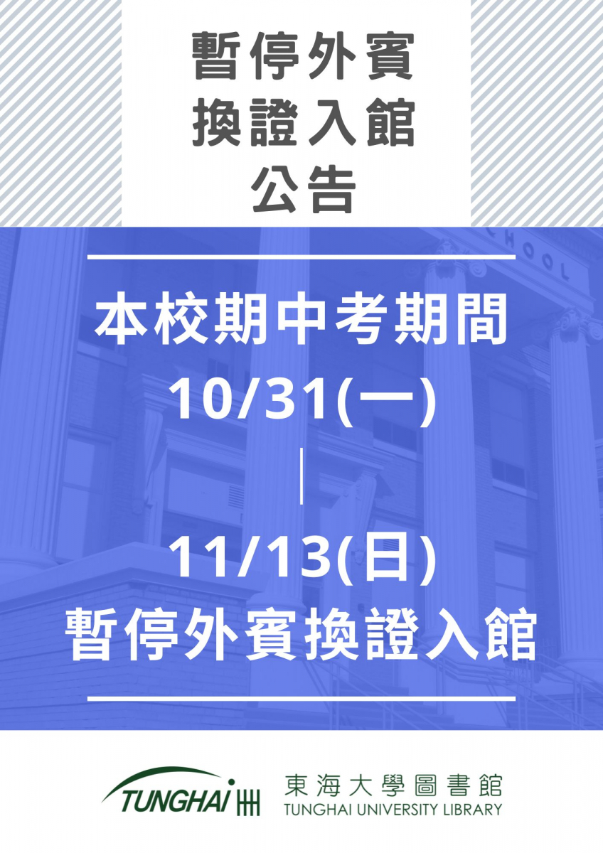 本校期中考期間10/31(一)-11/13(日)暫停外賓換證入館,若造成不便,請您見諒。