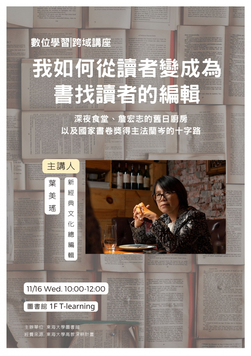 當編輯的人可能都曾在履歷上寫著:「喜歡閱讀」。不過,喜歡閱讀就適合從事編輯這一行嗎? 喜歡閱讀的讀者,跟喜歡閱讀的編輯,這兩種身分到底有甚麼不同?這個講座具體跟大家聊聊一本書的幕後編輯都在做甚麼。 講者:新經典文化 葉美瑤總編輯 日期:11/16(三) 10:00~12:00 地點:圖書館1F T-learning